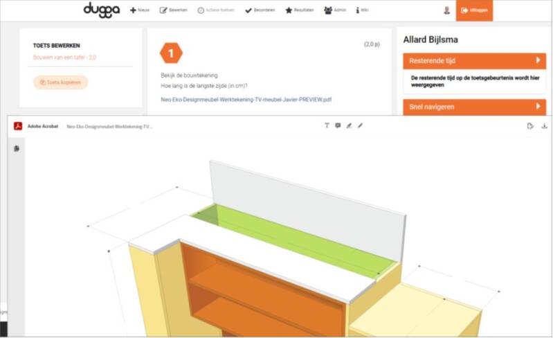 Voorbeeldcasus 2: een docent werkt bij een praktisch vak met gedetailleerde bouwtekeningen, die wel 5000×3500 pixels groot kunnen zijn. De toetsapplicatie schaalt die afbeeldingen tot binnen de schermranden, waardoor er geen details meer af te lezen zijn en dus ook geen antwoord op een vraag gegeven kan worden. Je kunt dan als tip geven die grote afbeelding op te slaan als PDF en die te koppelen aan de vraag. De leerling kan daarna onbeperkt inzoomen in de tekening, tijdens de toetsafname.