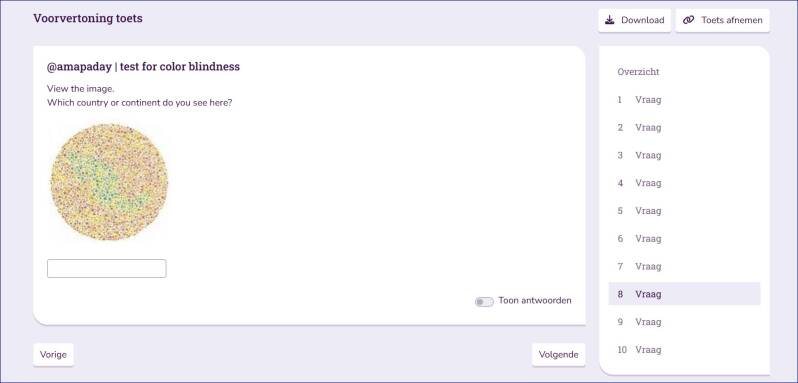 - Elke toets is te downloaden als zip in het formaat QTI 3.0. De toets is daarna te importeren in programma's als Dugga en daar verder te verwerken en af te nemen.