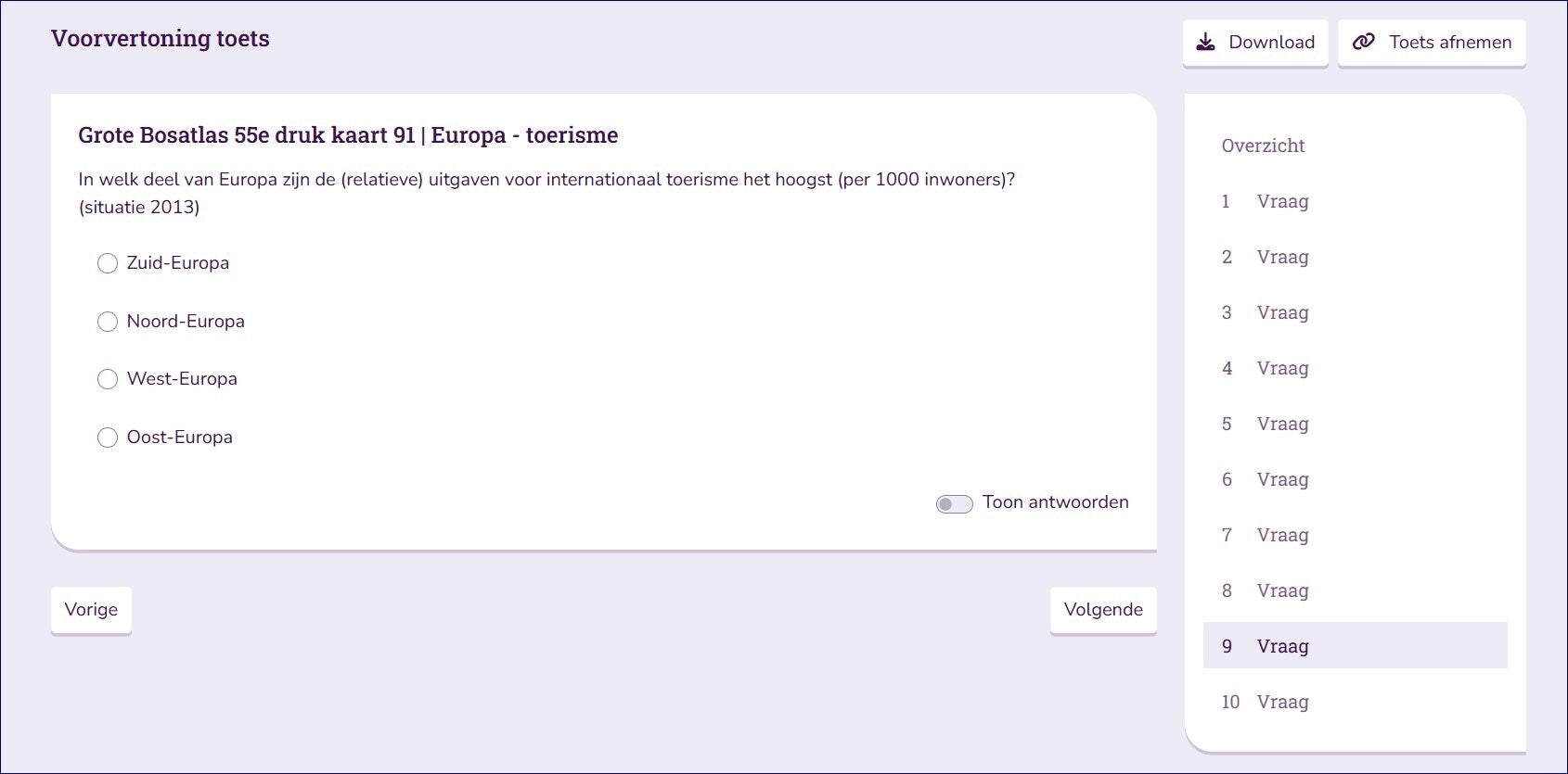 Welkom bij de Toetsenbank Aardrijkskunde, de grootste verzameling oefentoetsen voor scholen in het voortgezet onderwijs, voor gebruik binnen de online toetsapplicatie Wikiwijs en elk ander toetspakket dat een import kent op basis van QTI3. Deze Toetsenbank met oefentoetsen is gratis te gebruiken voor alle vo-scholen die een gratis toegang kennen tot Wijkiwijs (Kennisnet). De vragenverzameling is gebouwd door docenten en studenten aardrijkskunde. Voor het maken van de begripstoetsen, is gebruik gemaakt van AI. De vragenverzameling wordt nog regelmatig verder uitgebreid met nieuwe (oefen)toetsen.
